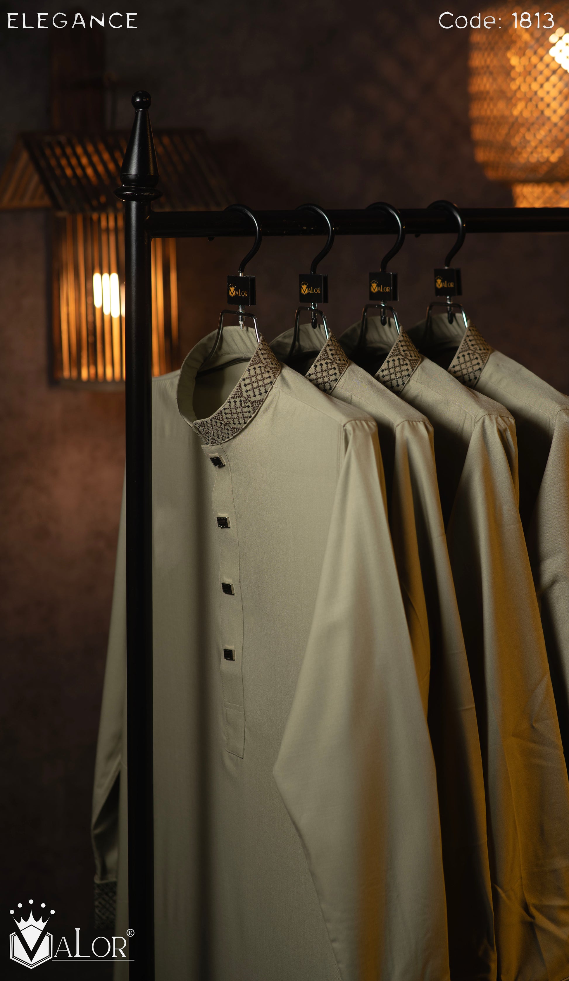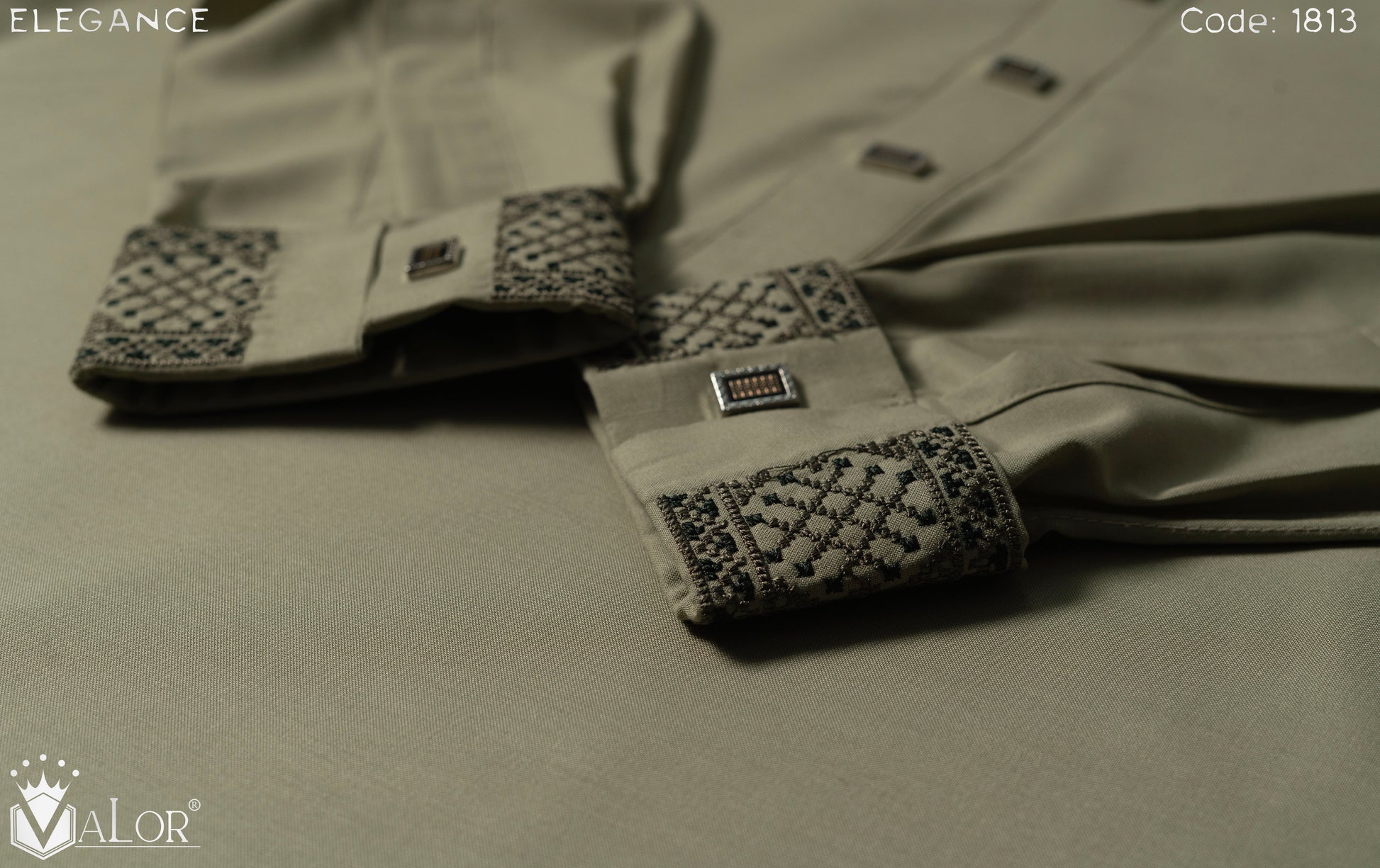 Delicate embroidery across the collar and cuffs adds a refined character to the design, complemented by premium metal buttons and precise finishing. The balanced detailing creates a look that feels graceful, modern, and effortlessly festive.