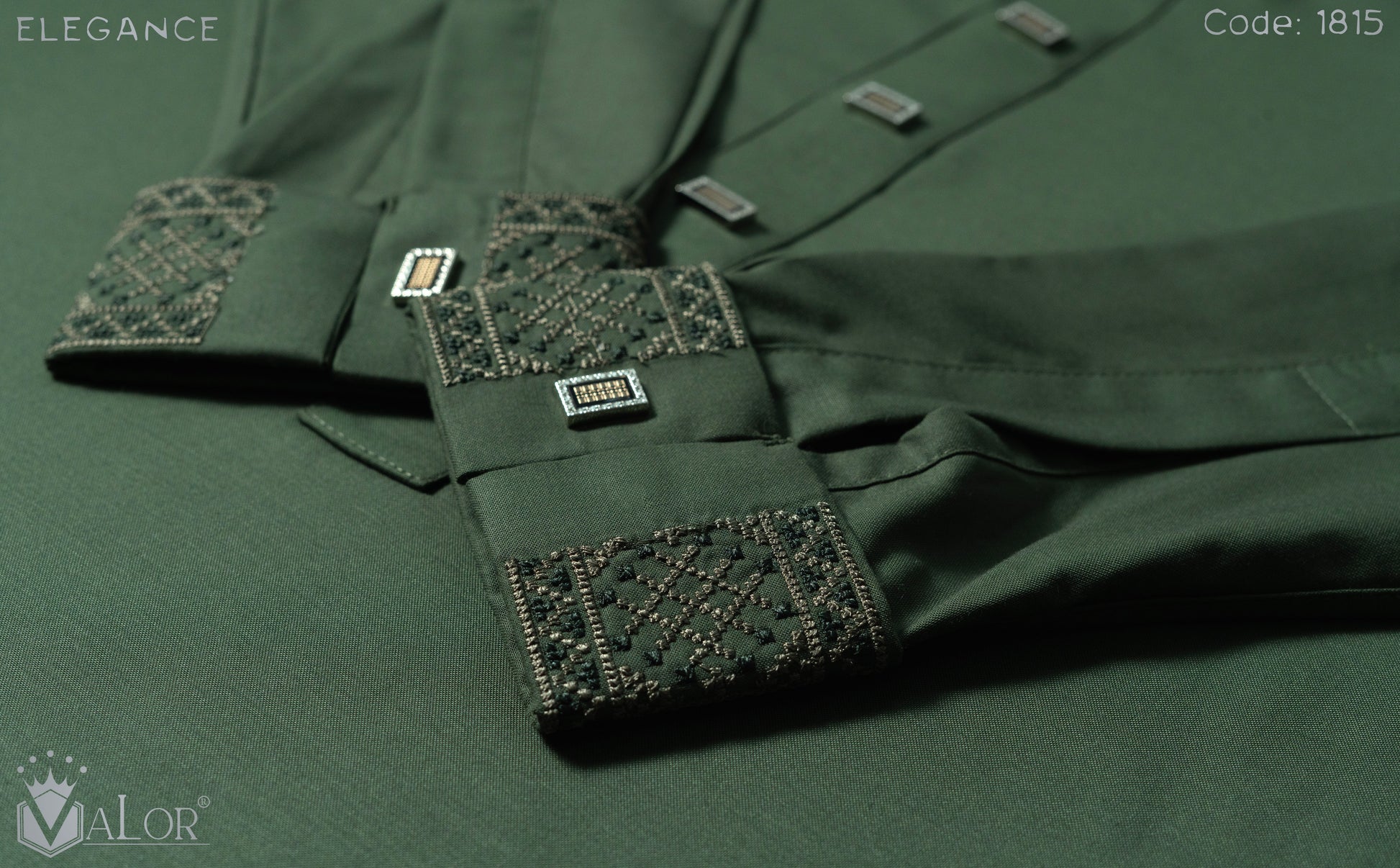 Delicate embroidery across the collar and cuffs adds a refined character to the design, complemented by premium metal buttons and precise finishing. The balanced detailing creates a look that feels graceful, modern, and effortlessly festive.