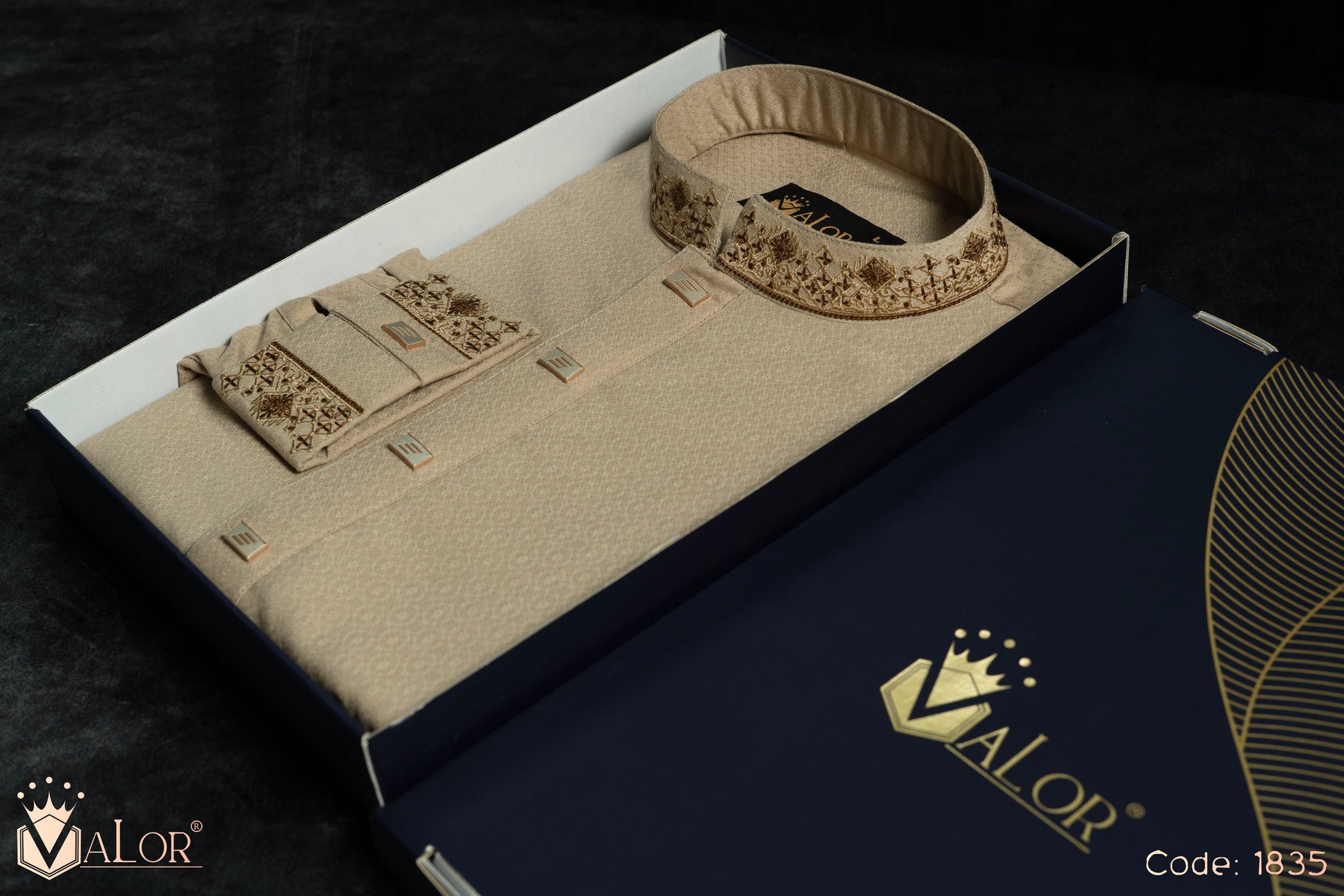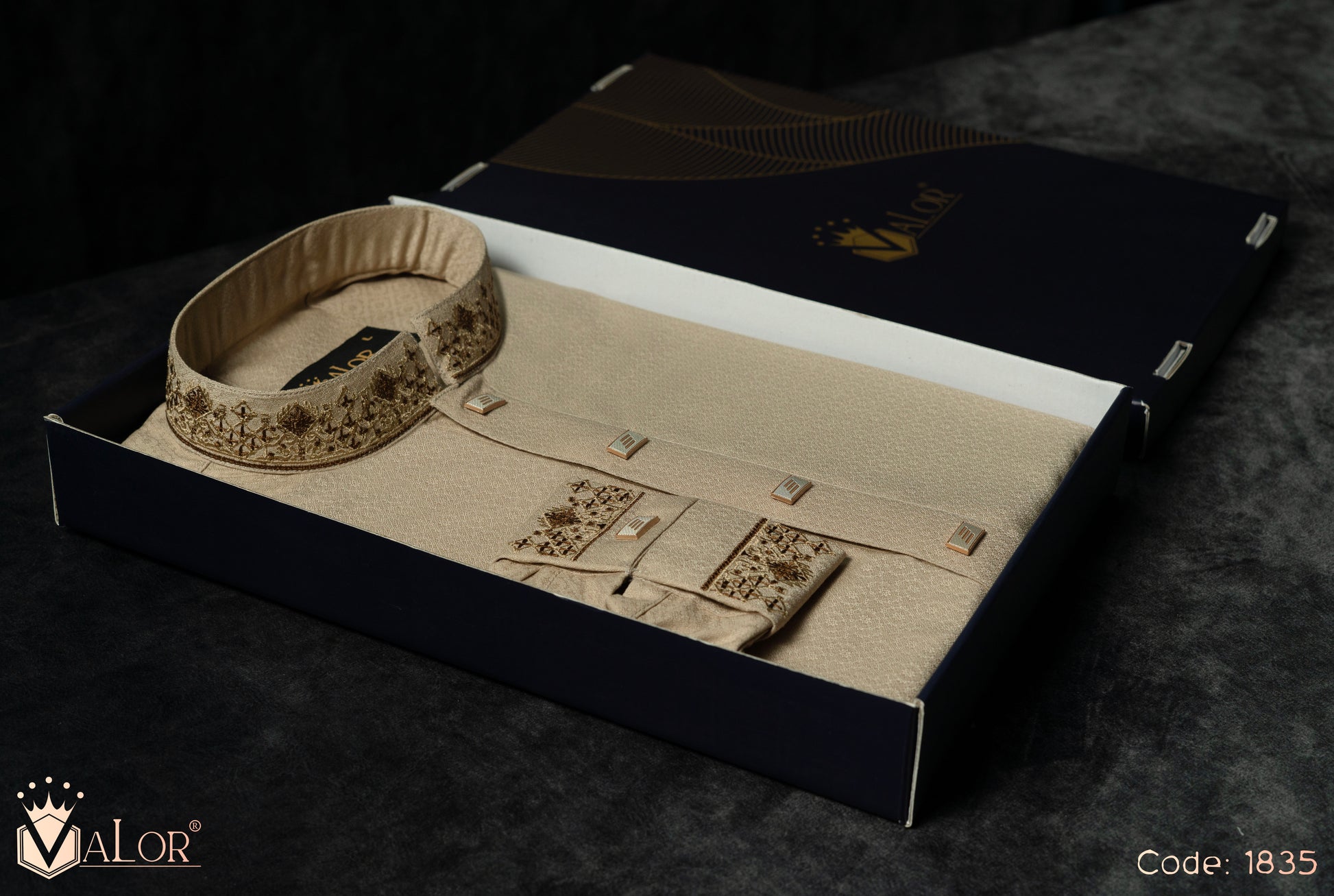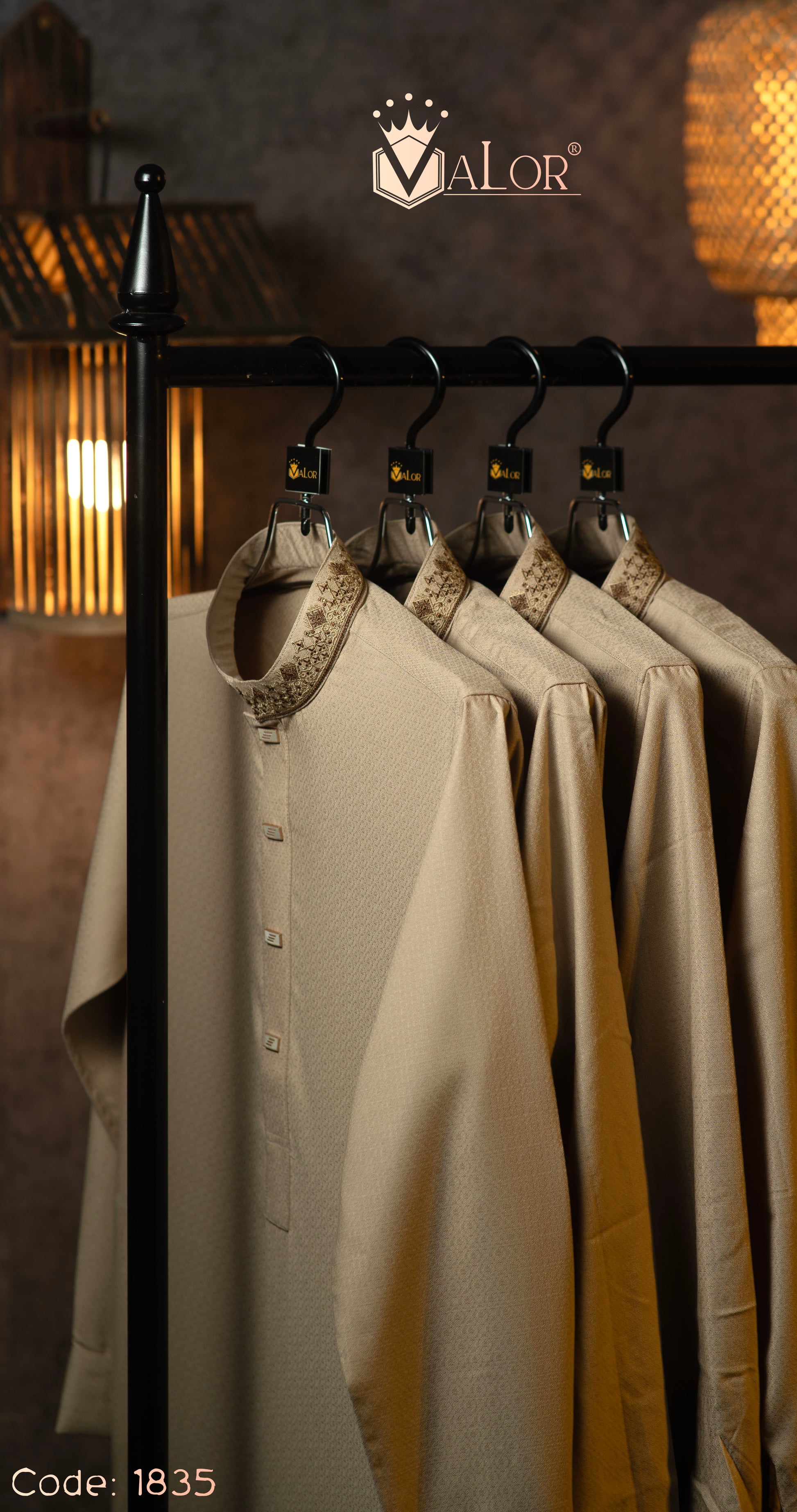Store your VALOR Panjabi in a cool, dry place, away from direct sunlight, to prevent fabric discoloration. Cover it with a breathable garment bag to protect it from dust.