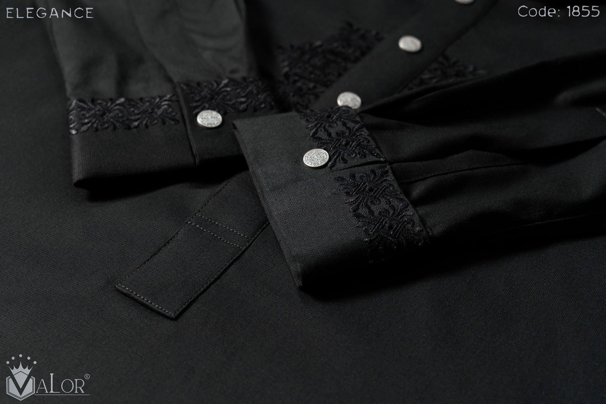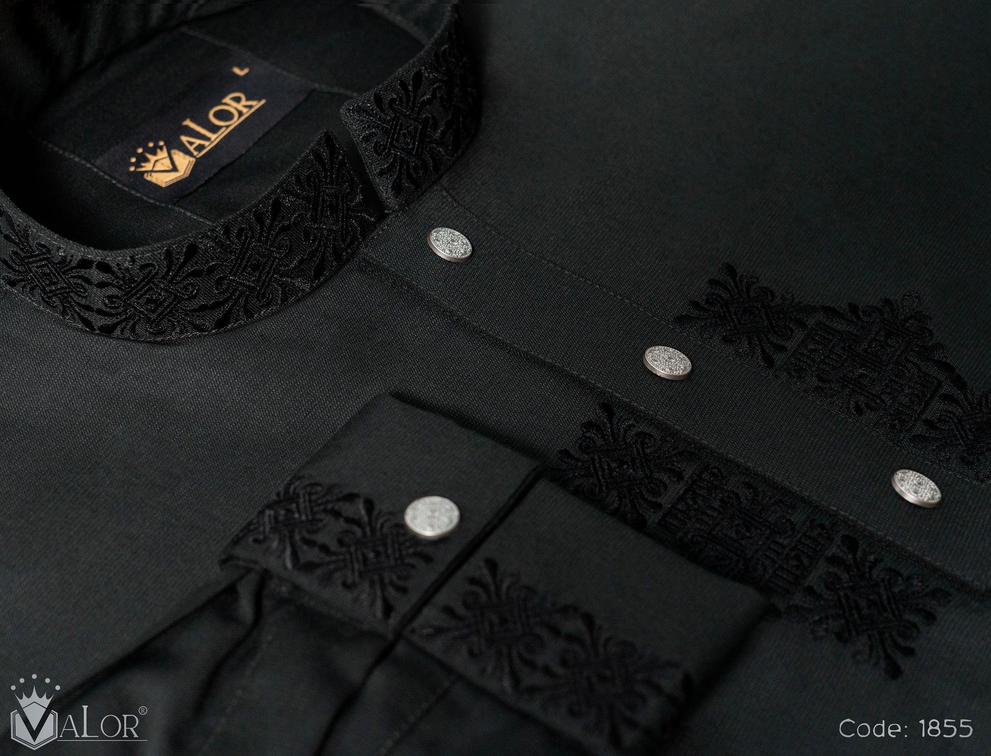Intricate tonal embroidery across the collar and placket, paired with premium metal buttons, creates a bold monochrome statement. Precision finishing enhances the richness of the black canvas, making it a powerful festive essential.