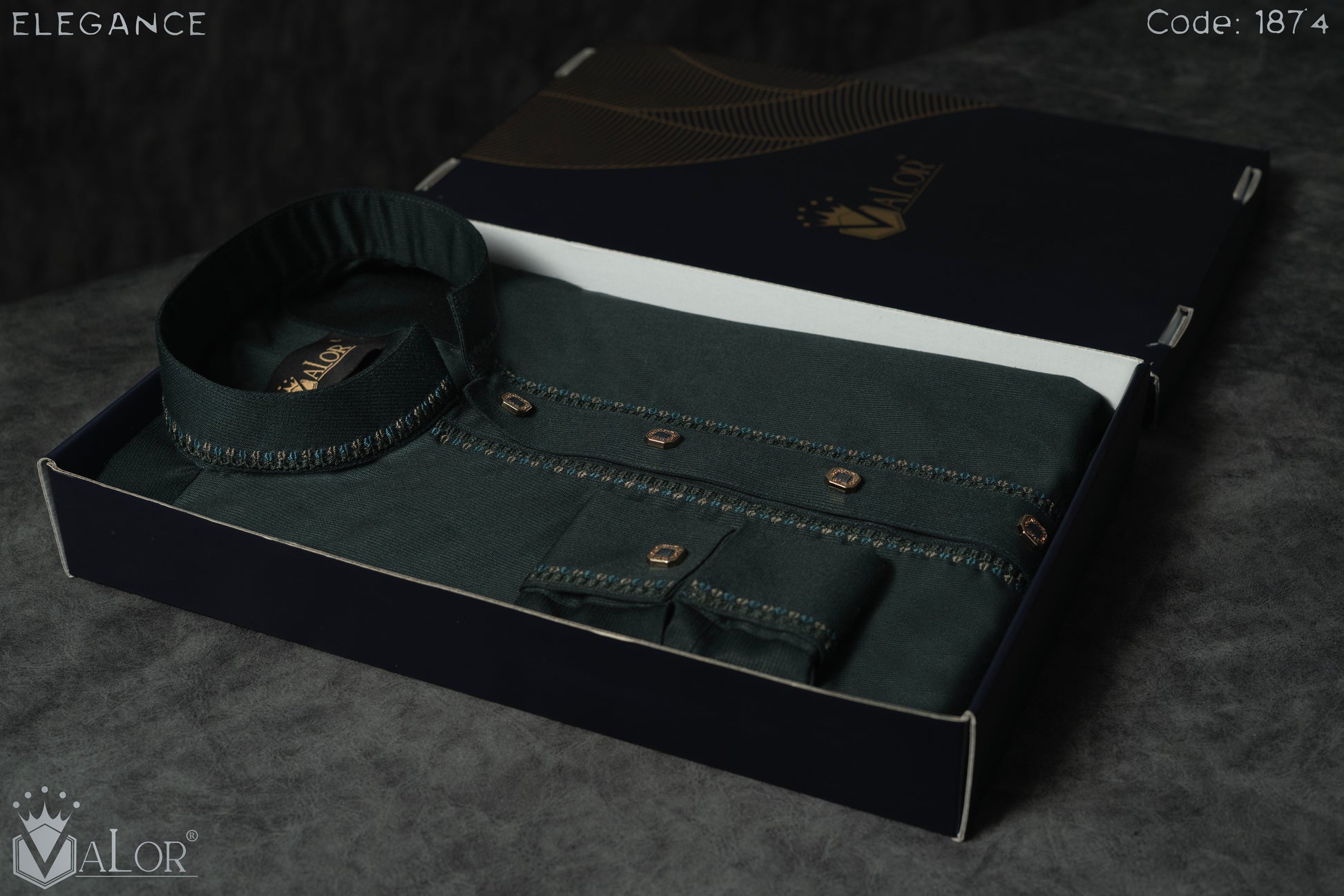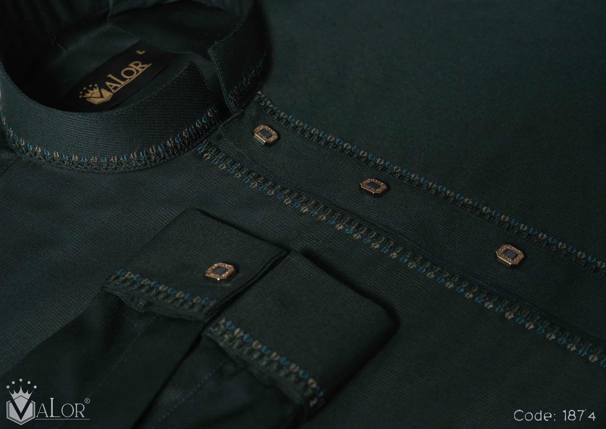 The rich Deep Emerald Green canvas is elevated with intricate collar and cuff embroidery, paired with premium matte metal buttons that enhance the depth and character of the design. Precision craftsmanship and flawless finishing create a statement that feels timeless, composed, and distinctly premium.