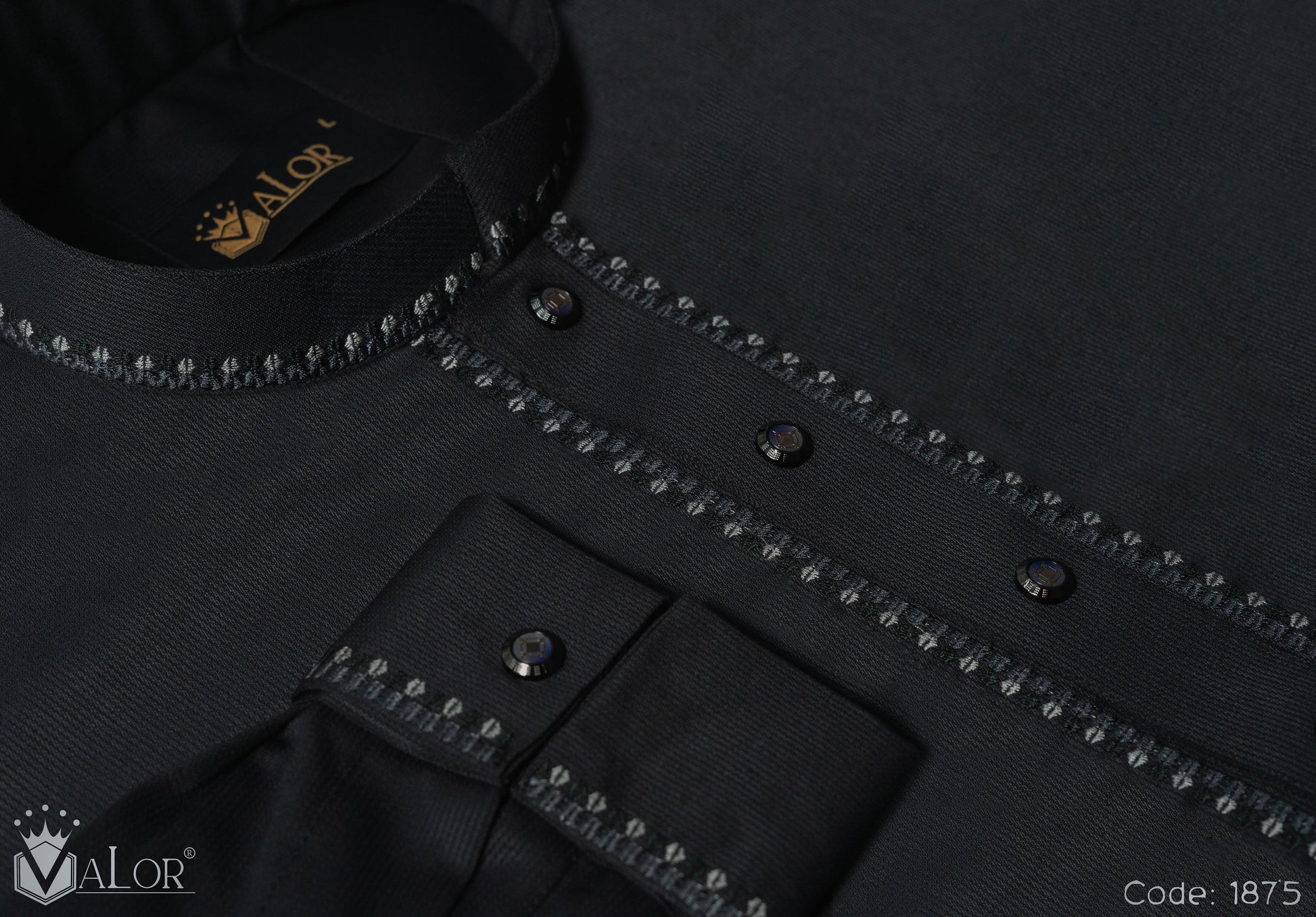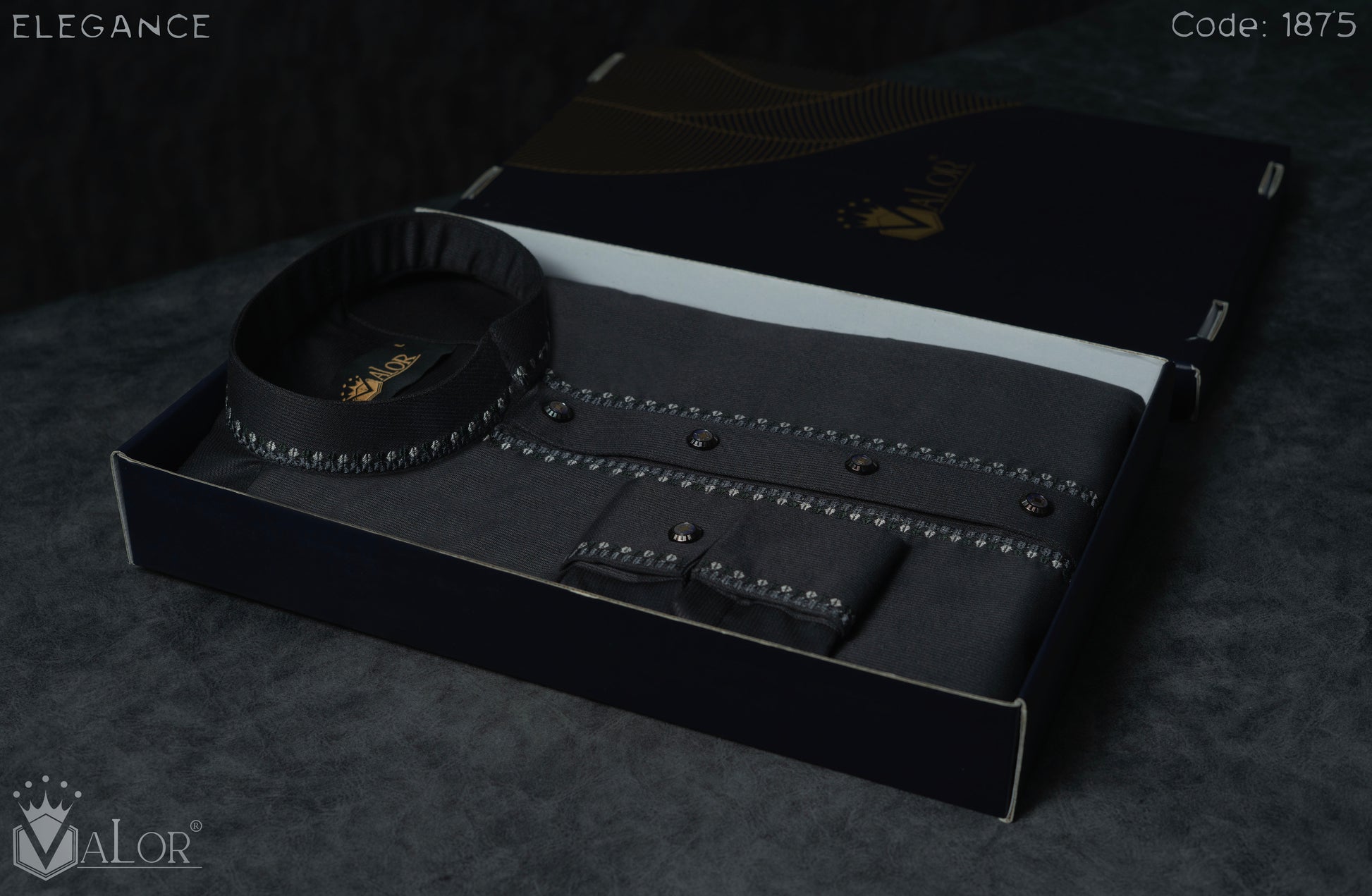 The rich Dark Ash Grey canvas is elevated with intricate collar and cuff embroidery, paired with premium matte metal buttons that enhance the depth and character of the design. Precision craftsmanship and flawless finishing create a statement that feels timeless, composed, and distinctly premium.