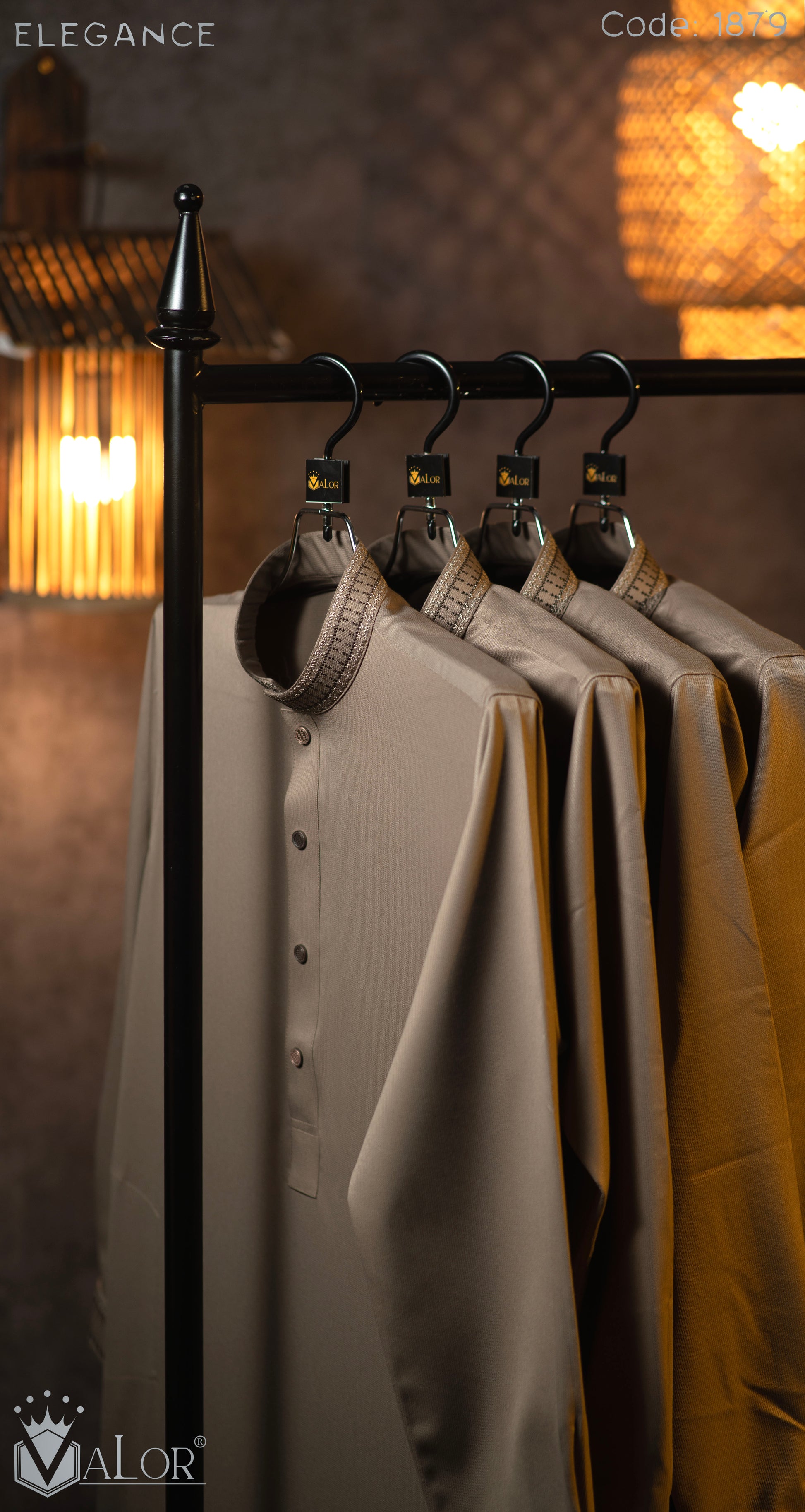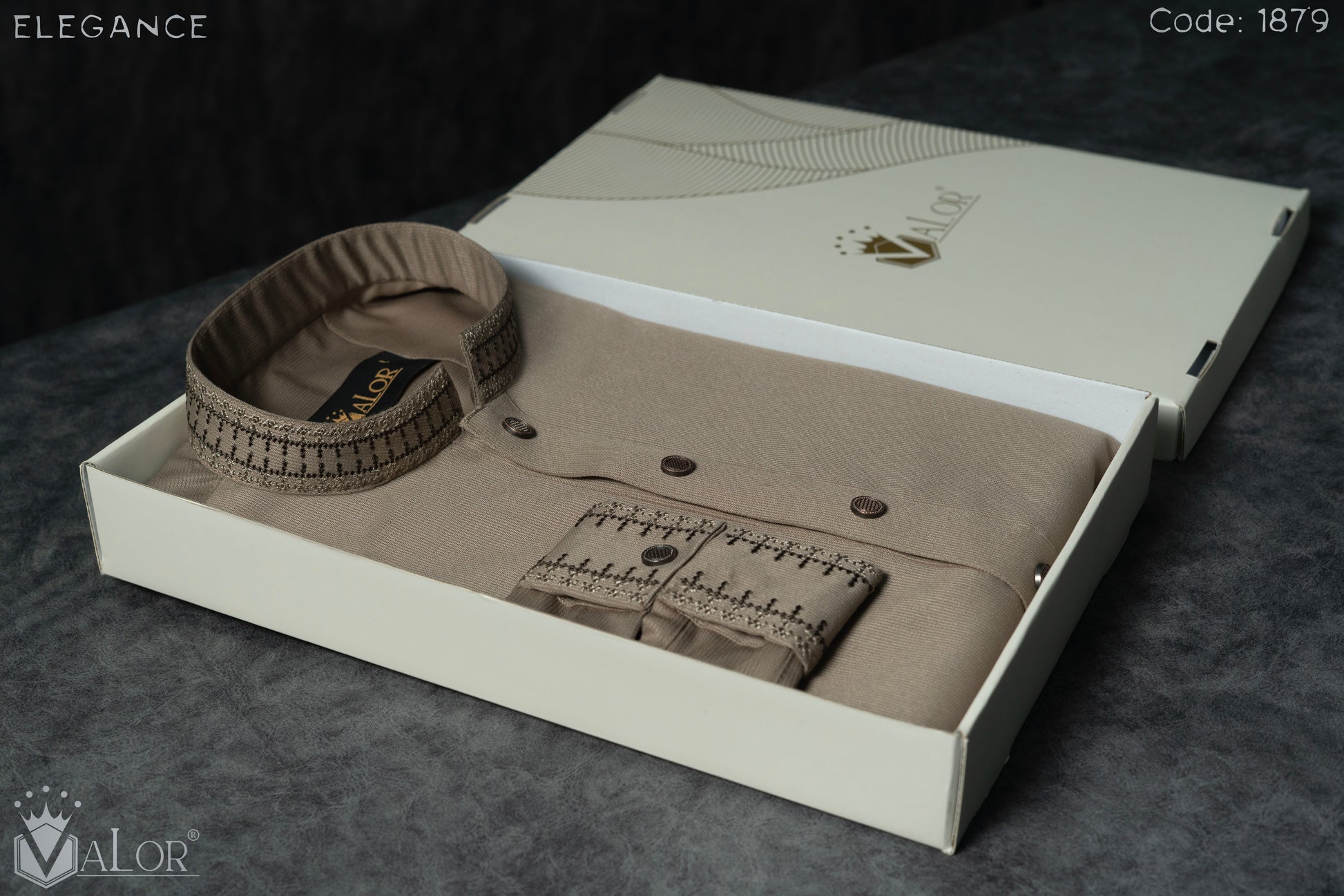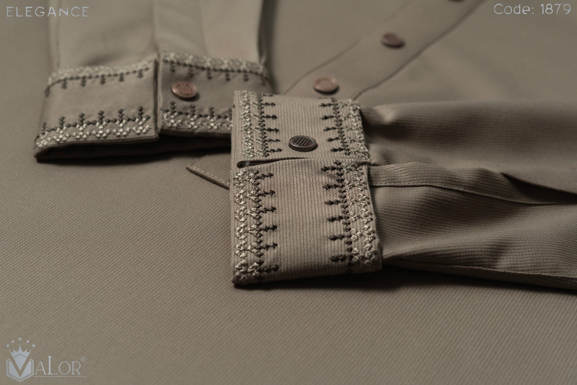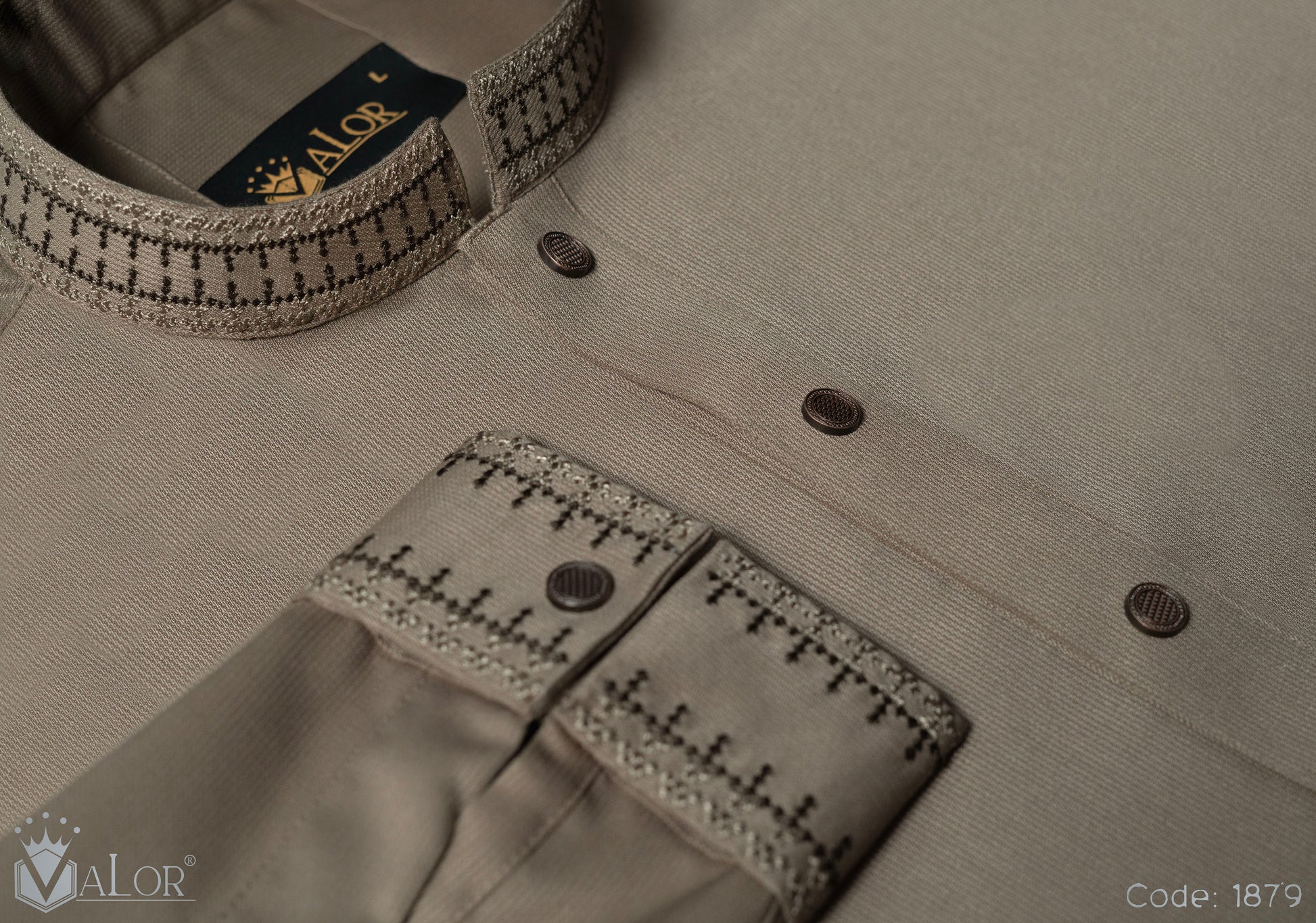 The rich Tone Taupe canvas is elevated with intricate collar and cuff embroidery, paired with premium matte metal buttons that enhance the depth and character of the design. Precision craftsmanship and flawless finishing create a statement that feels timeless, composed, and distinctly premium.