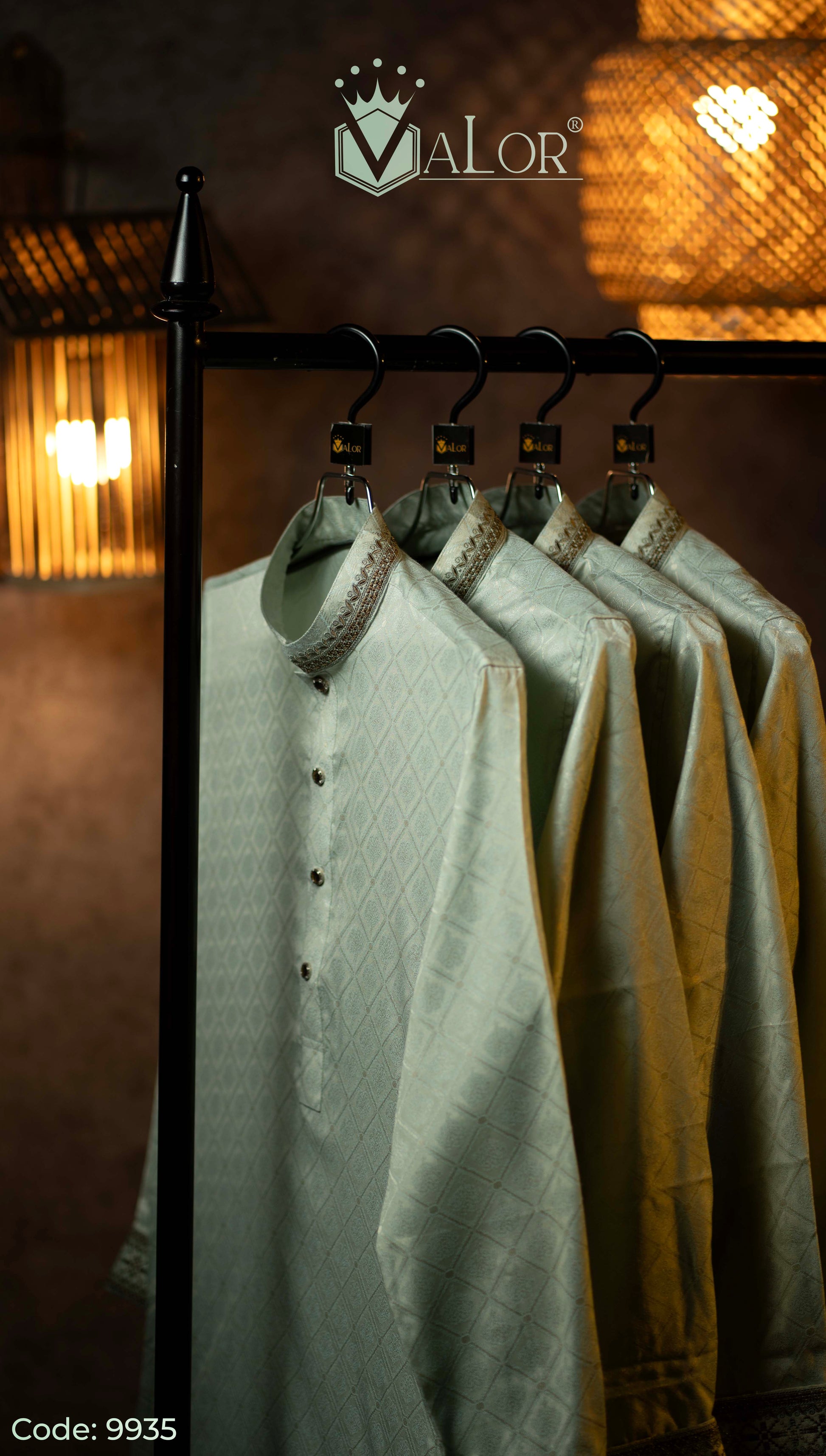 Store your VALOR Panjabi in a cool, dry place, away from direct sunlight, to prevent fabric discoloration. Cover it with a breathable garment bag to protect it from dust.