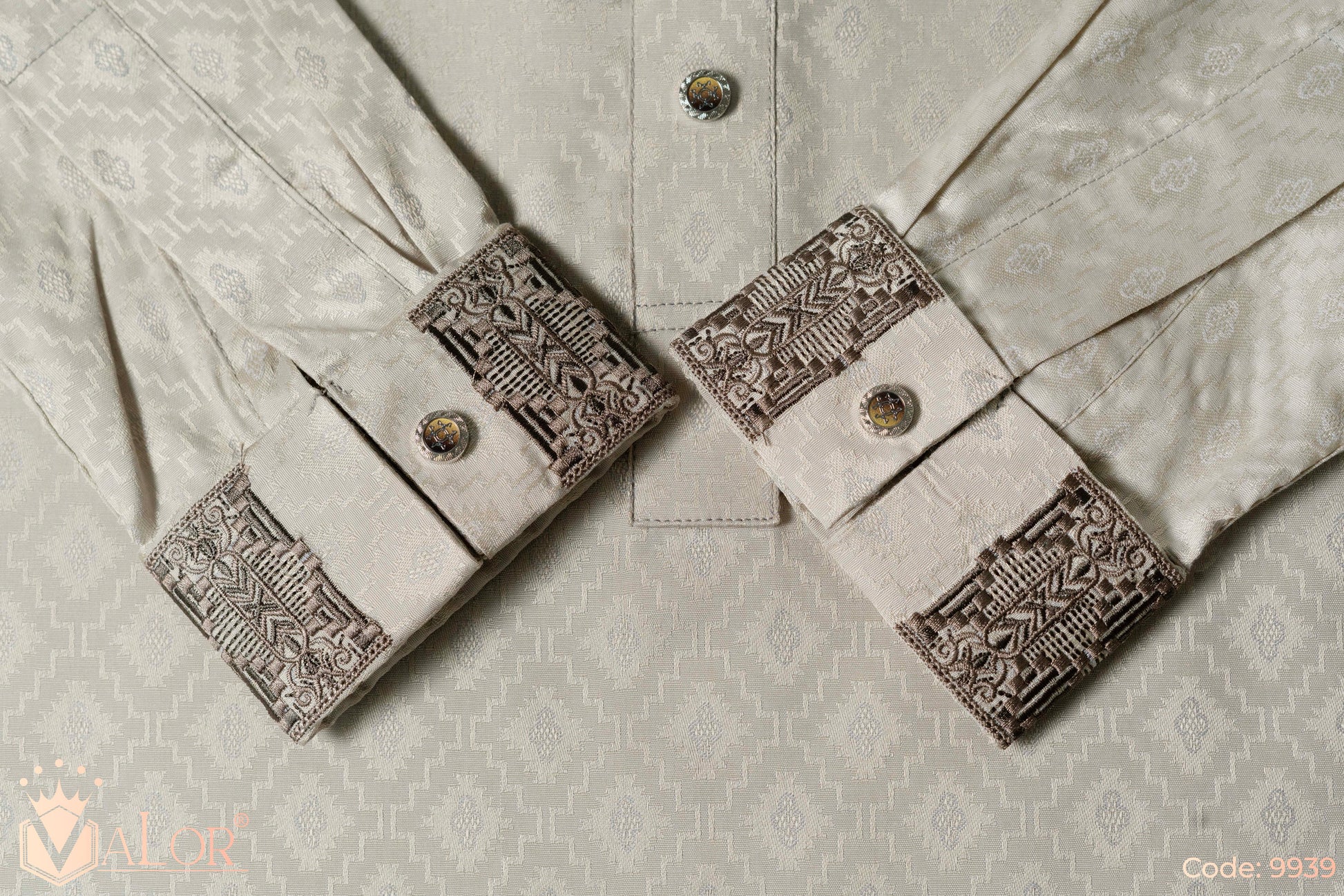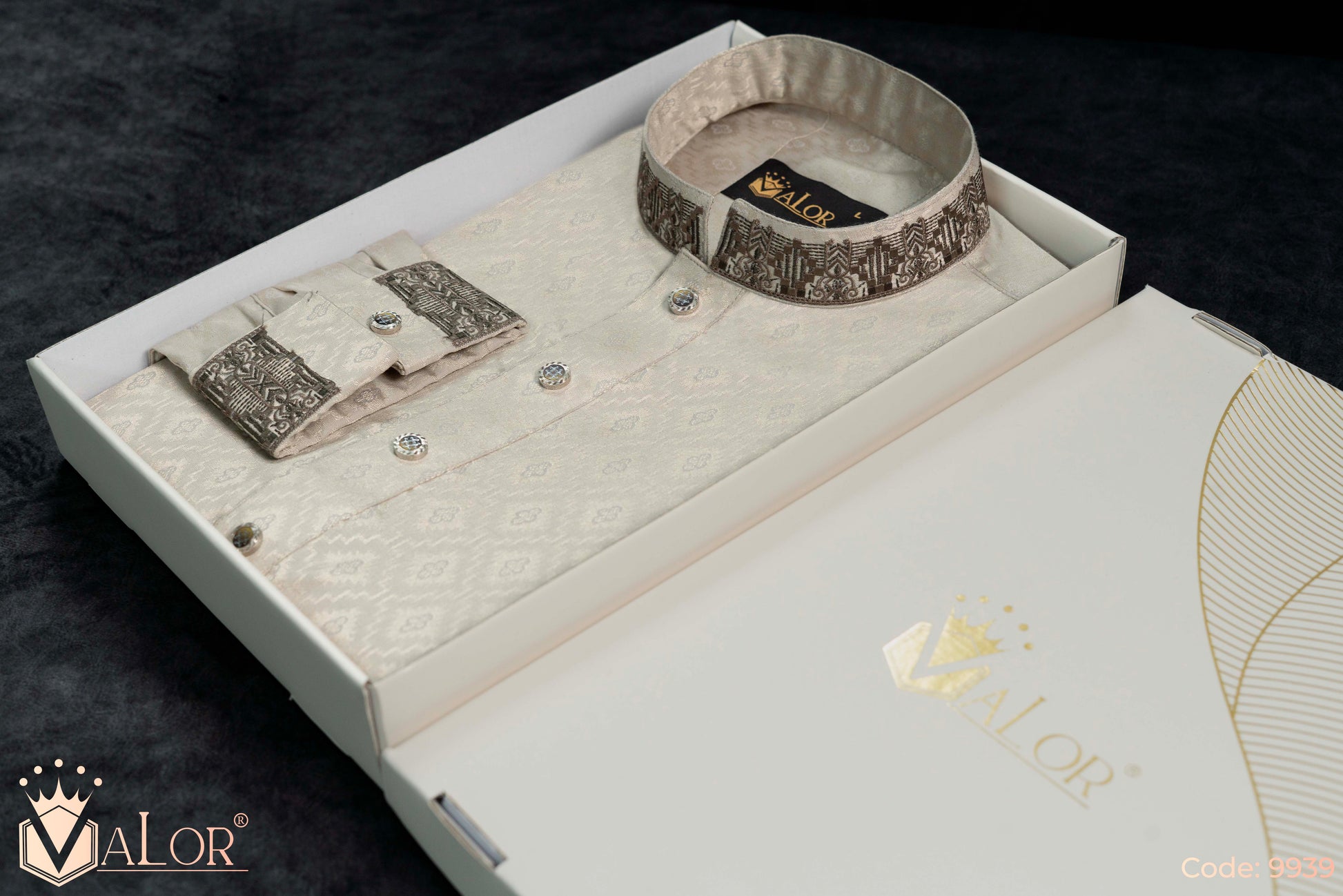 Store your VALOR Panjabi in a cool, dry place, away from direct sunlight, to prevent fabric discoloration. Cover it with a breathable garment bag to protect it from dust.