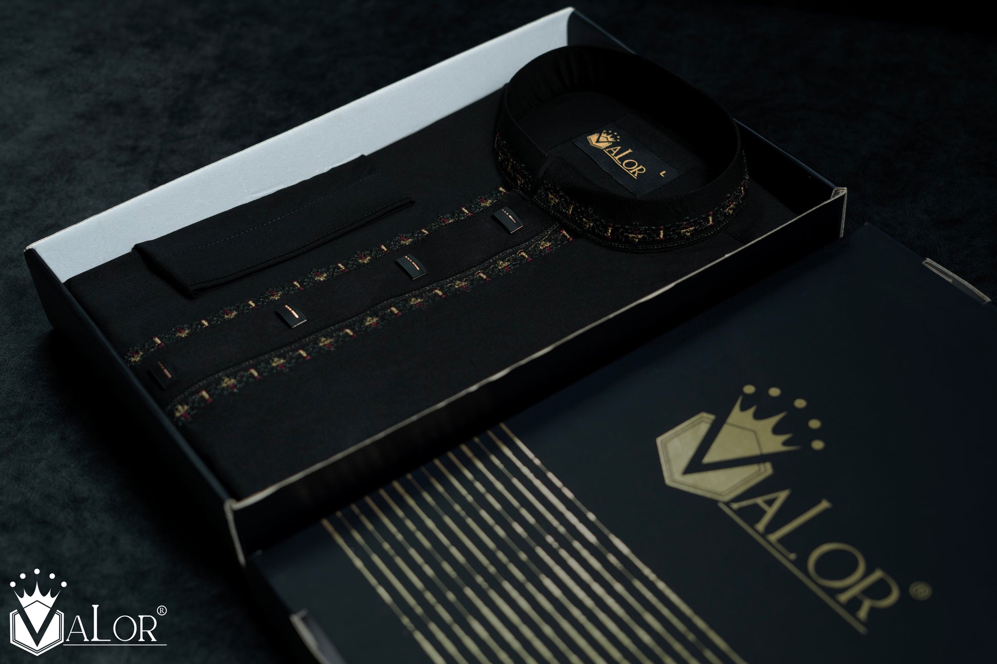 Storage: Store your VALOR Panjabi in a cool, dry place, away from direct sunlight, to prevent fabric discoloration. Cover it with a breathable garment bag to protect it from dust.