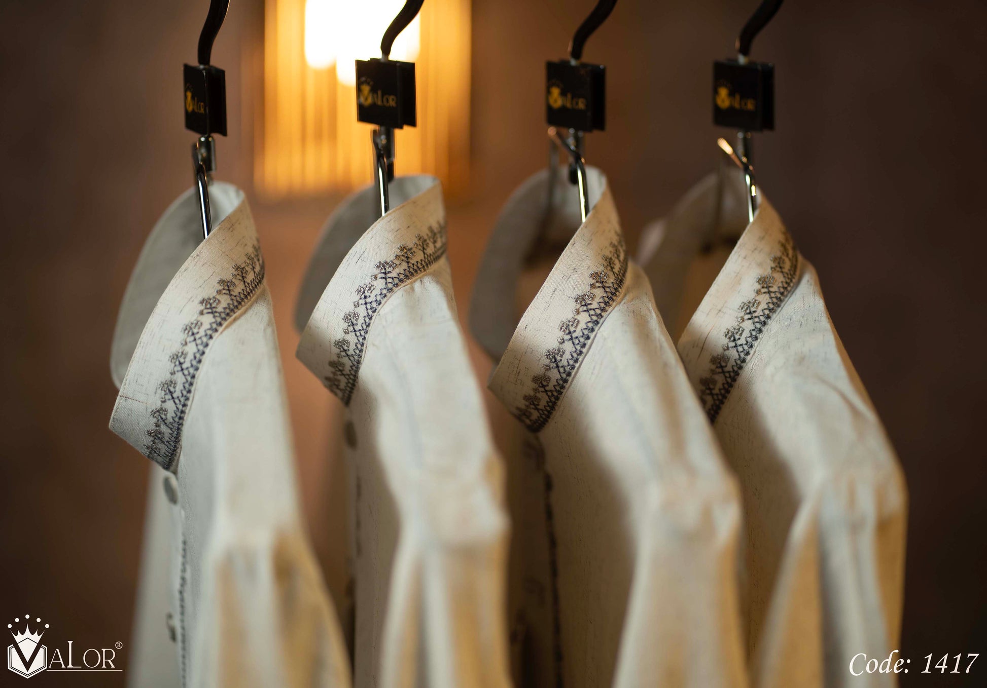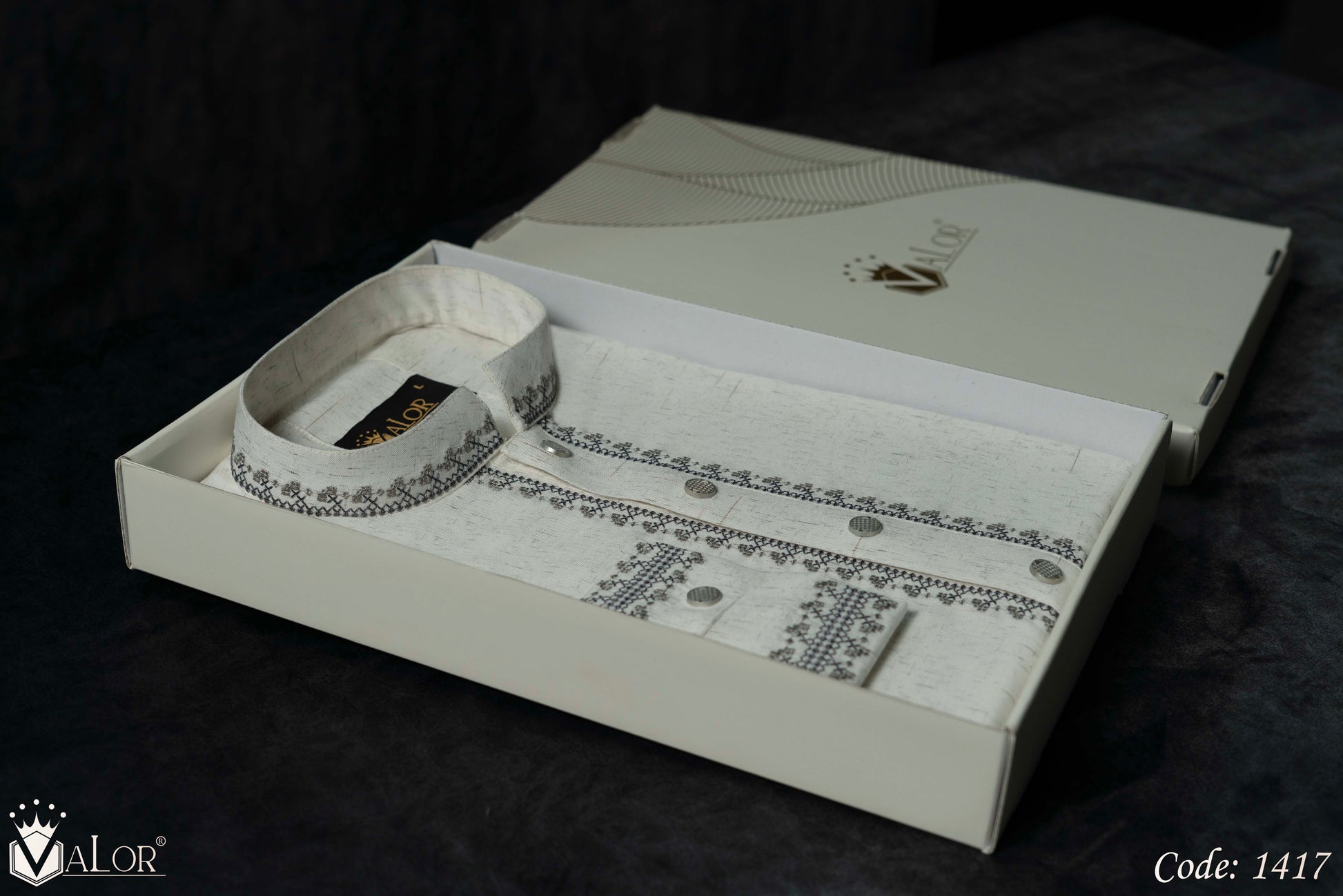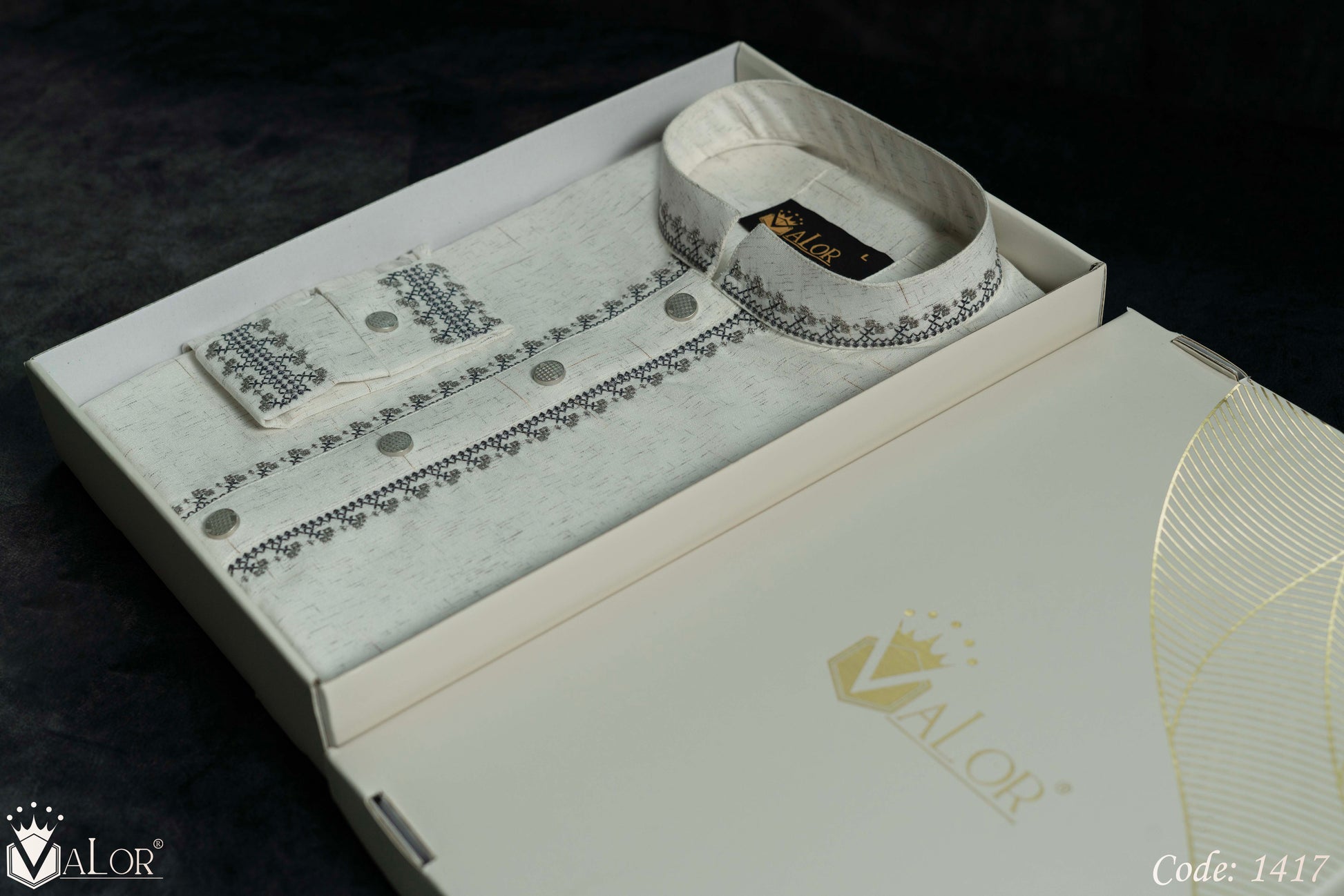 Store your VALOR Panjabi in a cool, dry place, away from direct sunlight, to prevent fabric discoloration. Cover it with a breathable garment bag to protect it from dust.