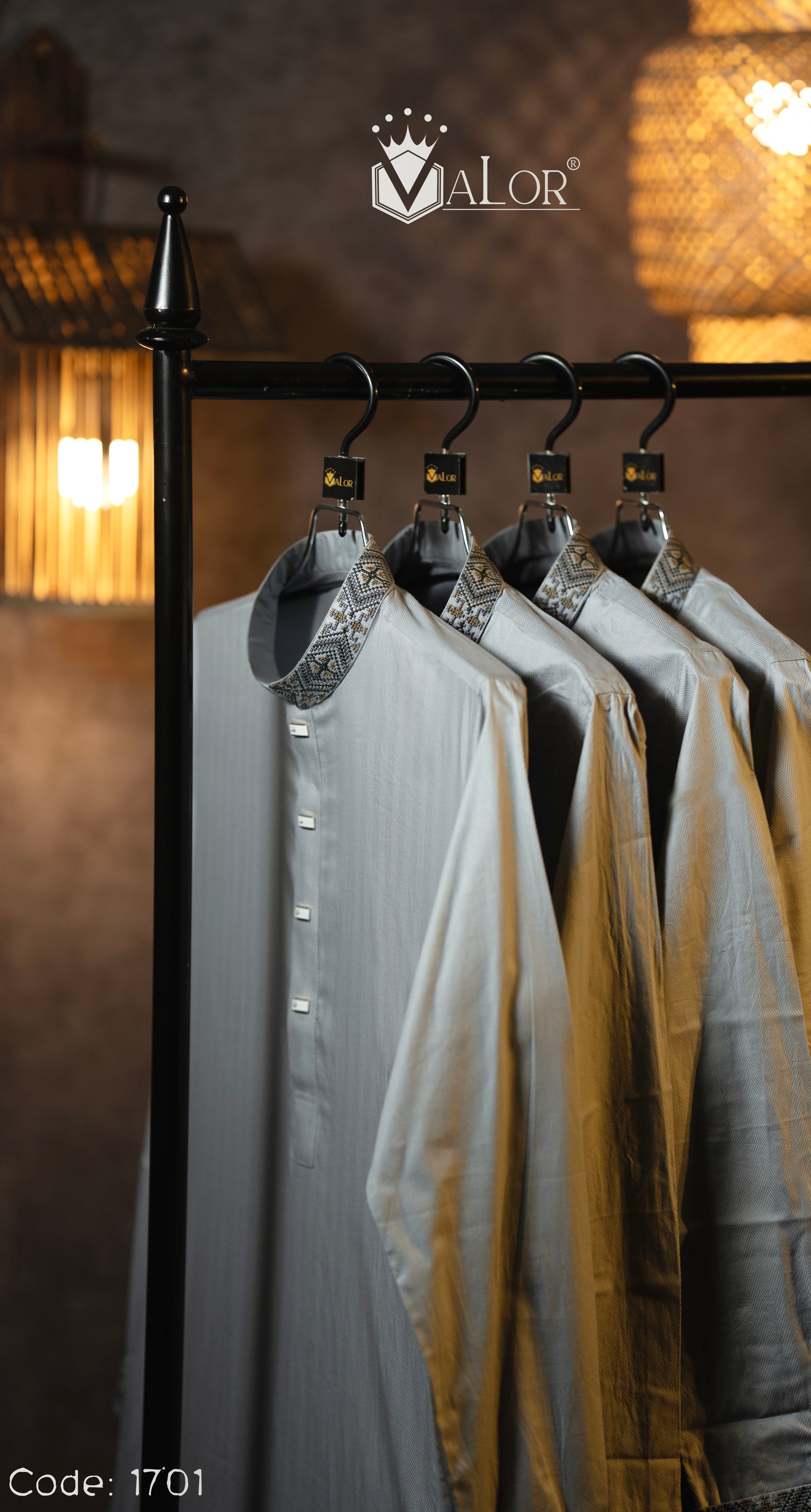 Store your VALOR Panjabi in a cool, dry place, away from direct sunlight, to prevent fabric discoloration. Cover it with a breathable garment bag to protect it from dust.