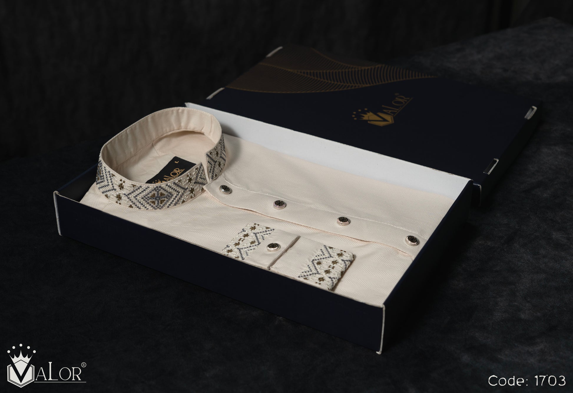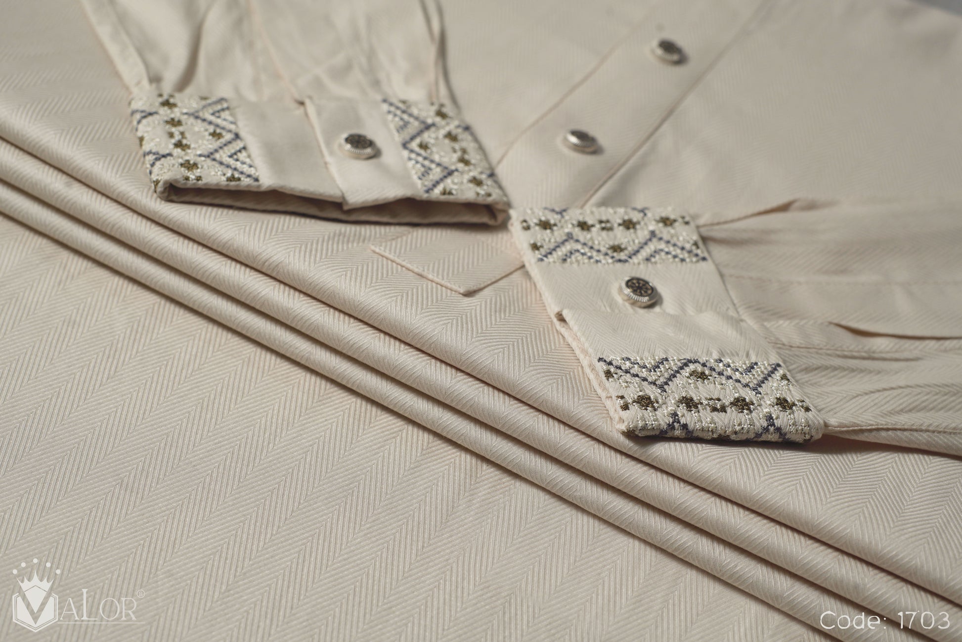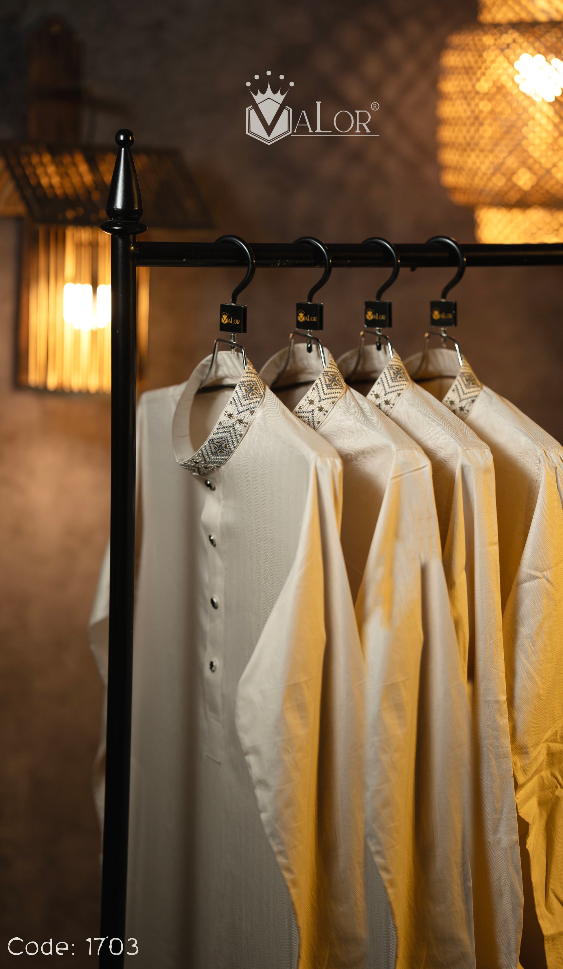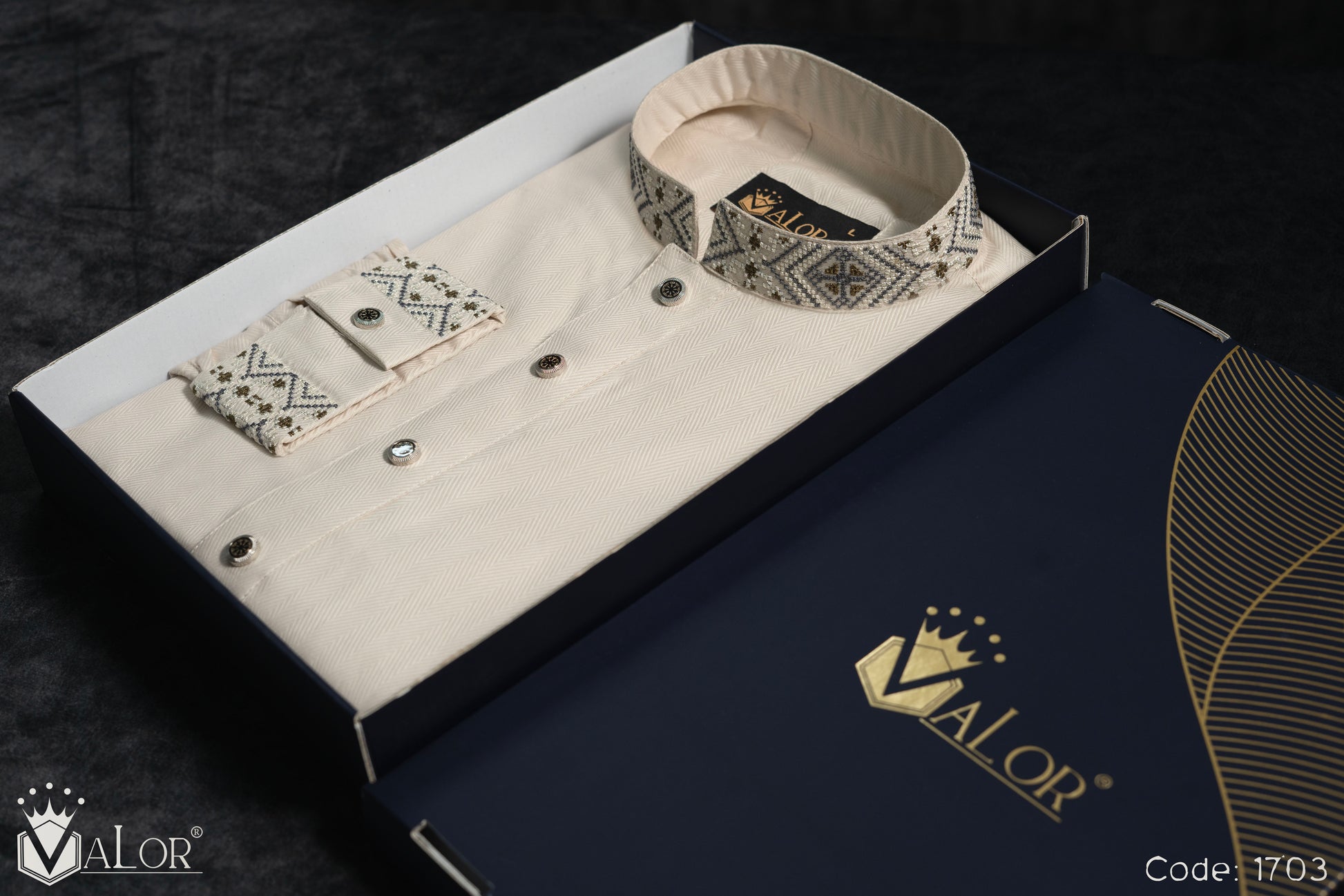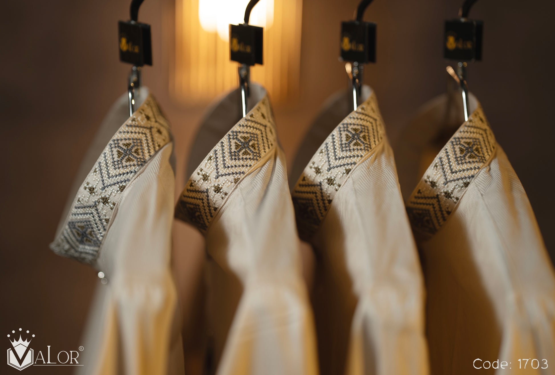 Store your VALOR Panjabi in a cool, dry place, away from direct sunlight, to prevent fabric discoloration. Cover it with a breathable garment bag to protect it from dust.