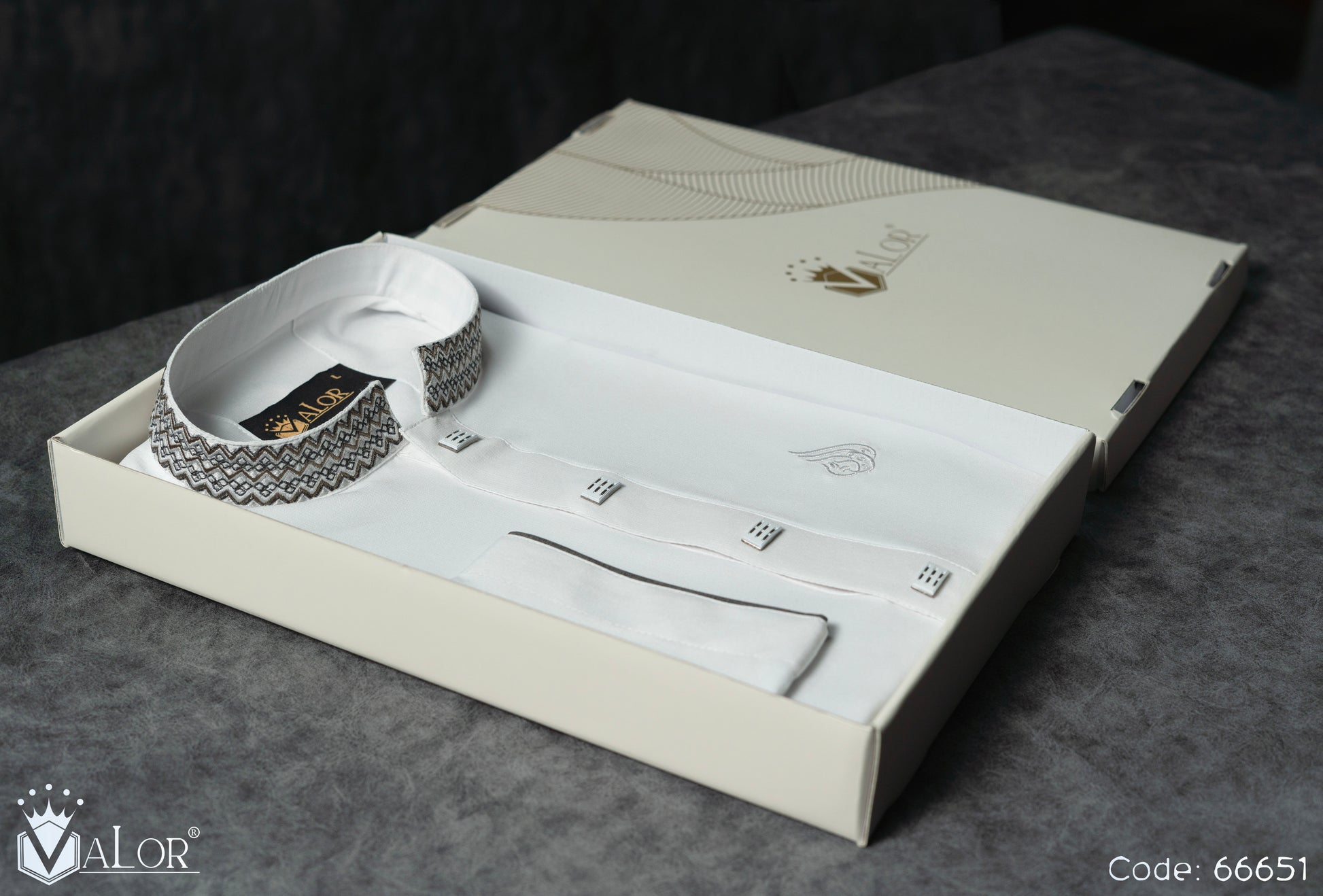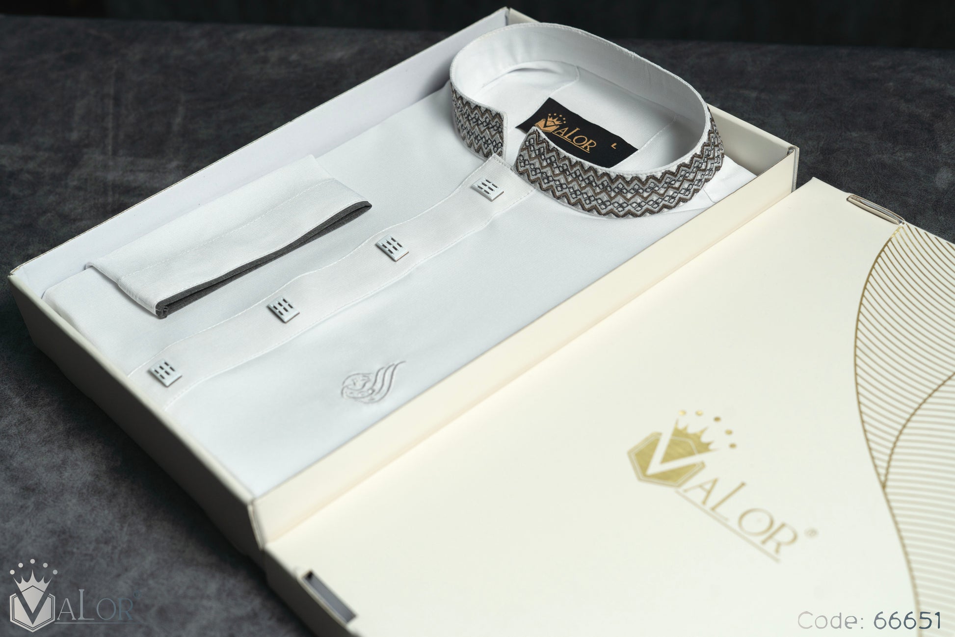 Store your VALOR Panjabi in a cool, dry place, away from direct sunlight, to prevent fabric discoloration. Cover it with a breathable garment bag to protect it from dust.